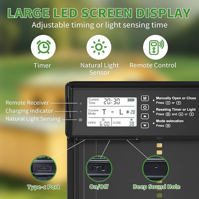 • 【Mix 4 Modes Chicken Door】 It is designed with four multi-functional modes: remote control mode, manual mode, light sensor mode and timer mode. You can use the timer function to set specific opening and closing times so that chickens enter and exit the coop at fixed times. It can also use a light sensor to automatically open and close the door based on light intensity. chicken door makes coop management easier, saving time and energy while ensuring the safety and comfort of your chickens