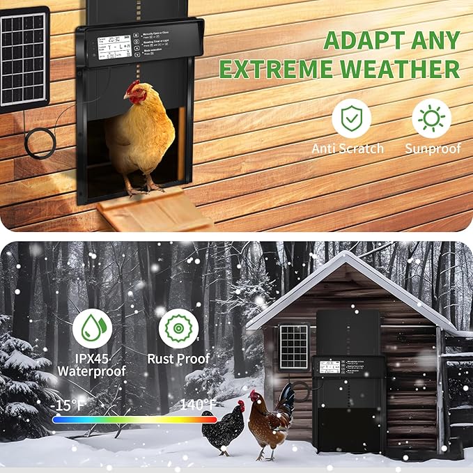 • 【Premium Quality Material】 This durable and sturdy solar automatic chicken coop door is made of aluminum alloy and ABS material, providing reliable protection even in remote or harsh conditions. Chicken door automatic can work in rain, snow and sandy weather from -15℃ to 50℃