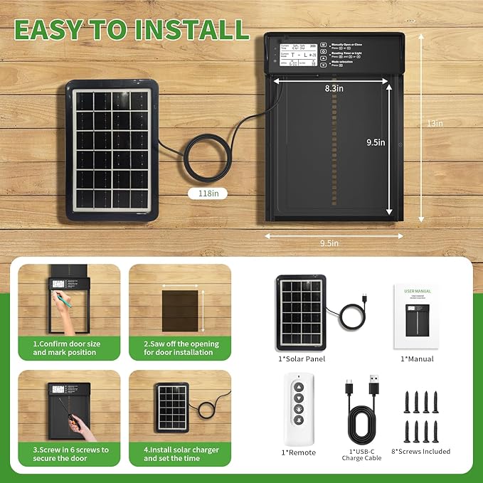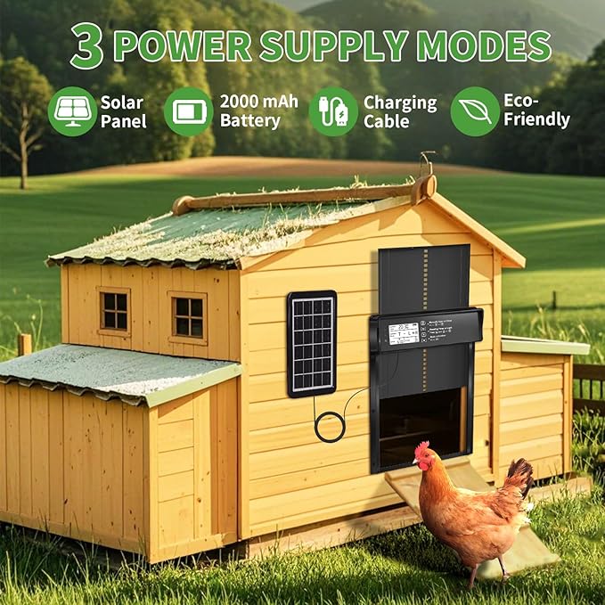 • 【Solar Chicken Coop Door】 Automatic chicken door has an internal battery with a capacity of 2000mAh and can be powered by one of three options: USB-c cable (included) for charging, battery power, and solar power. With a built-in timer and light sensor, the solar coop door makes it easy to set the electric chicken door to open or close at specific times or based on natural light conditions (morning and evening). The timer function ensures that the poultry are taken care of while you are away