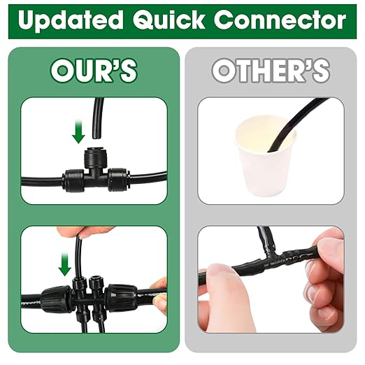 • [New Quick Connector Design] - Our upgrade plug-and-play irrigation kit features a quick connector design for easy installation, and the Quick connector can be fully installed on the tubing without worrying about water leakage!