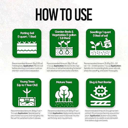 • Natural Mulch for Soil Health – Acting as an environmently friendly mulch, these wool pellets effectively suppress weeds, retain moisture, and enhance soil structure. This 100% natural organic fertilizer creates a nutrient-rich environment for vegetables, fruit trees, potted flowers and other plants, while expanding in the soil to improve porosity and aeration.