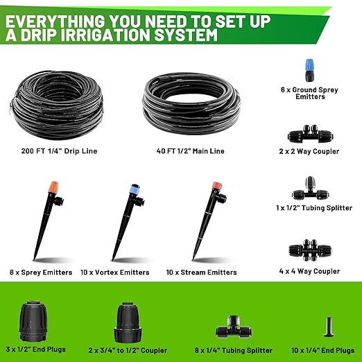 • Drip Irrigation System: The ultimate garden watering solution, upgraded and improved! This kit includes 34 drip emitters, 40FT of 1/2" mainline, 200FT of 1/4" tubing, various connectors, and a complete installation guide. Effortlessly meet all your garden's watering needs