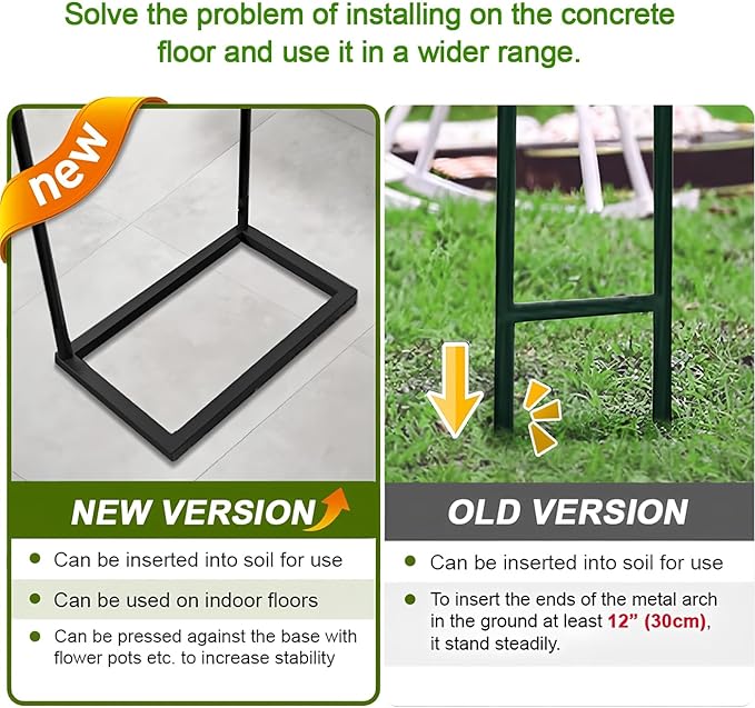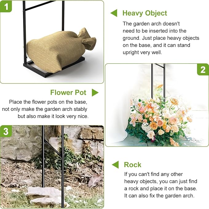 • With Thickened Bases:The garden arch has 2 thckend bases,which is duty and durable.It's secure and reliable, so the whole frame won’t be easy to wobble or move.Moreover if you want the arch more stronger in windy weather,you can easily equipe the arch with water bags or sand bags easily.