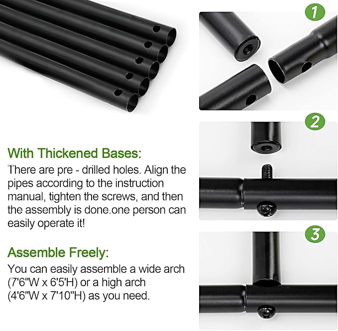 • Assembly Dimensions: You can easily assemble a high arch(4.6 Feet Wide x 7.9 Feet High) . It is suitable for various climbing flowers and green plants such as vines.