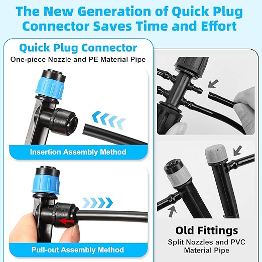 • QUALITY MATERIAL: The old barbed type drip irrigation system is made of PVC water pipe, so it will be knotted or deformed, thus affecting the effect of water spraying, used as outdoor garden drip irrigation system only about half a year's time will be aging and cracking, thus causing water leakage. And our new quick-plug type garden drip irrigation system is made of PE water pipe, to avoid the shortcomings and shortcomings of PVC water pipe, it will not be deformed more will not aging and cracking, in the watering of plants to avoid leakage, its service life of up to 10 years.