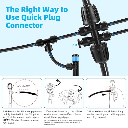 • EASY AND QUICK TO ASSEMBLE: Quick connect fittings are great and prevent leaks. SUPER EASY TO ASSEMBLE. The system is great, easy to build and easy to assemble. Different sizes of drip irrigation kit attachments are much better than the standard attachment system.