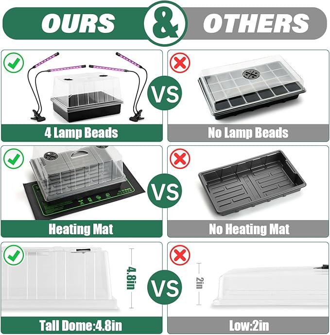 • 【All-in-One Seed Starter Kit】Kickstart your gardening journey with RooTrimmer complete seed starting kit, featuring a sturdy bottom tray, 5-inch humidity dome, full-spectrum grow lights, and a waterproof 1020 heat mat. Designed for fast and healthy germination, everything you need in one kit—just plant, grow, and watch your seedlings thrive!