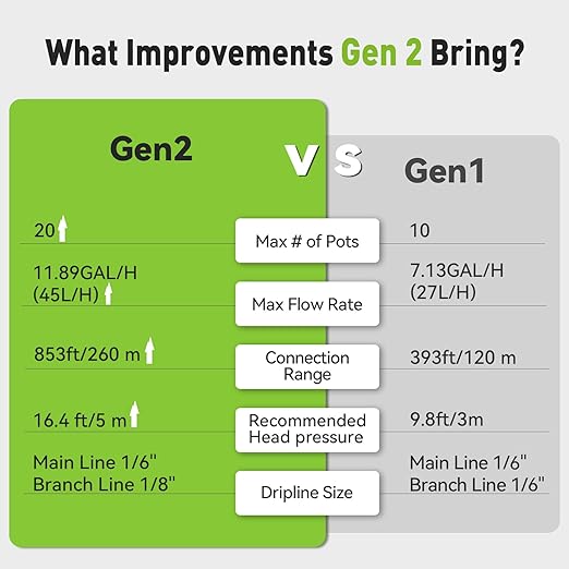 • 【🚀Higher Pumping Output】‌Our Gen2 WiFi waterer features a premium motor that delivers greater pump head(16.4ft/5m recommend), making it easy to nourish 20 lush plant varieties - from cascading pothos to sun-loving succulents. With it, your indoor garden will become a thriving oasis where you can sip your coffee as new leaves unfurl and time melts into your thriving oasis.