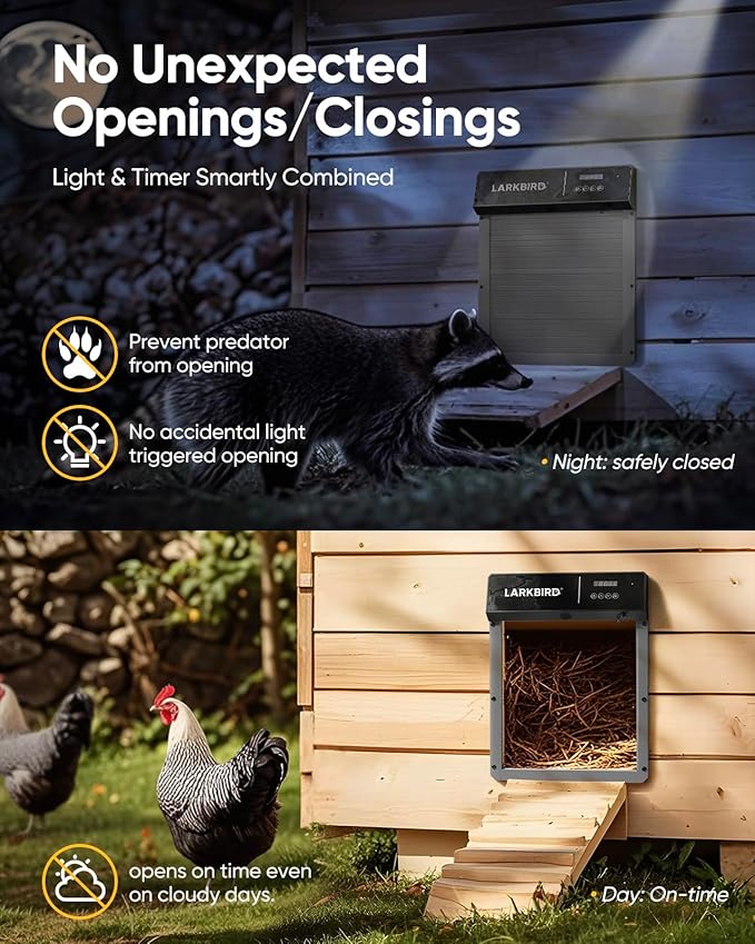 • Smartest Light Assistance: Our innovative [Timer+Light] mode not only enables the coop door to operate based on light but also prevents random openings and closings at unwanted times, offering far greater reliability than the traditional light-only models