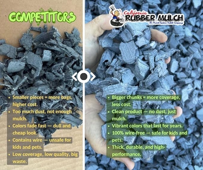 • 100% Wire-Free and Safe for Playgrounds Made from recycled tire sidewalls, this rubber mulch is completely free of metal wires, offering a clean, safe surface ideal for children’s play areas and pet zones.