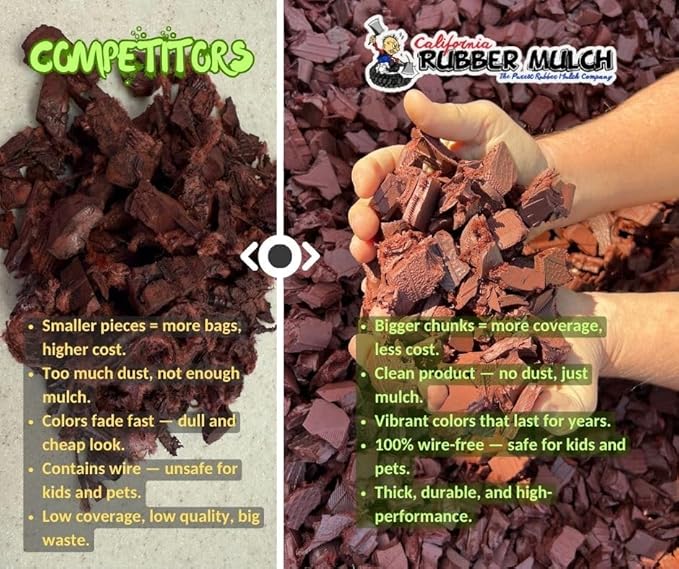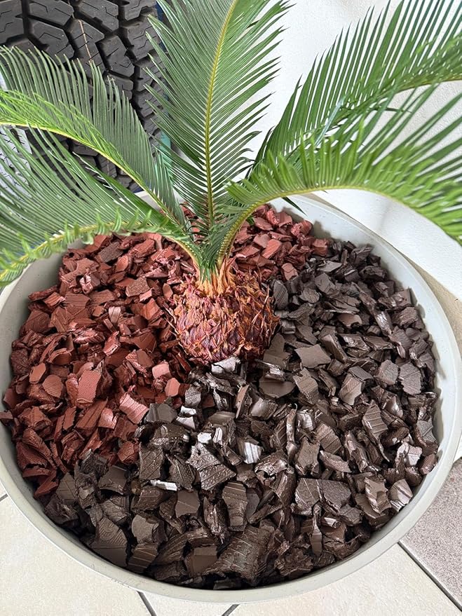 • Eco-Friendly Landscaping Solution Made from 100% recycled rubber, this mulch helps reduce landfill waste and supports a circular economy. A sustainable alternative to traditional wood mulch.