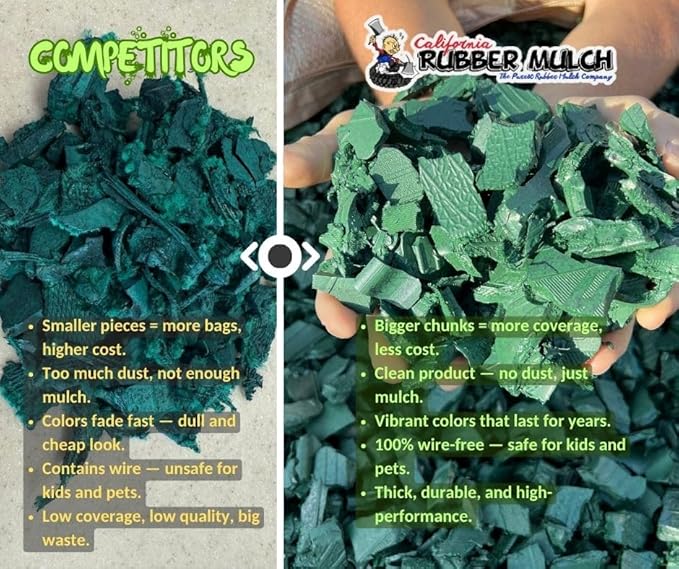 • Eco-Friendly Landscaping Solution Made from 100% recycled rubber, this mulch helps reduce landfill waste and supports a circular economy. A sustainable alternative to traditional wood mulch.