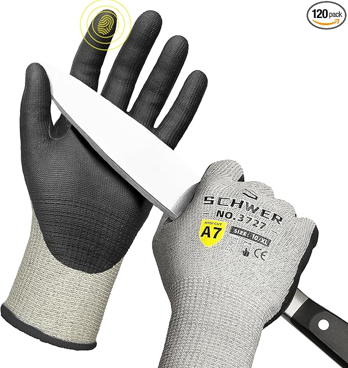 • Ultimate Cut Defense: Engineered with ANSI A7 cut resistance certification, the high tier of blade resistance, these rugged gloves deliver proven protection against severe slicing hazards. Built to outperform standard Level 5 cut resistant gloves, they combine industrial-grade durability with precision grip for brutal work scenarios like metal fabrication, glass handling, or demolition tasks where ordinary gloves fail