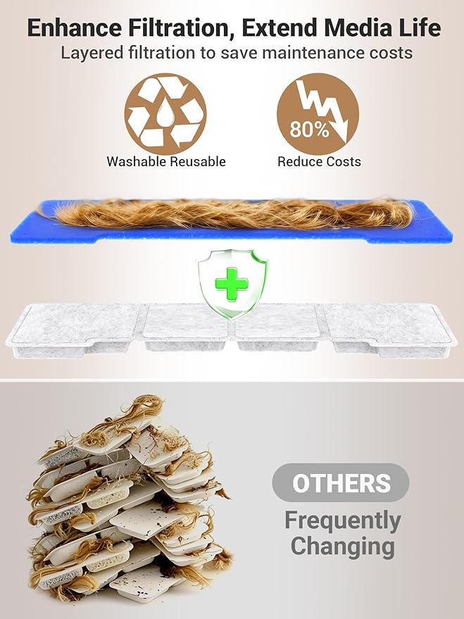 • 5-Layer Filtration:The dog water fountain 4-layer filtration system with an additional filter sponge effectively captures dust, hair, and odors, ensuring clean and healthy drinking water for your dog