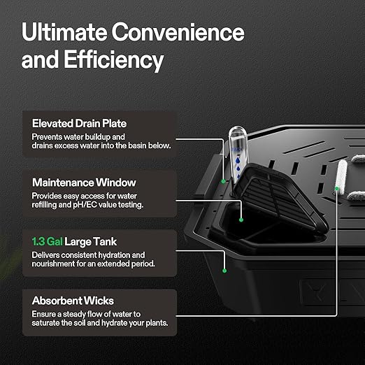 • Generous Capacity: The 1.3-gallon (6L) tank steadily hydrates and nourishes your plants for up to a week, ideal for extended vacations; The Kit includes a 4-pack self-watering pot base and 4-pack 5-gallon grow bags