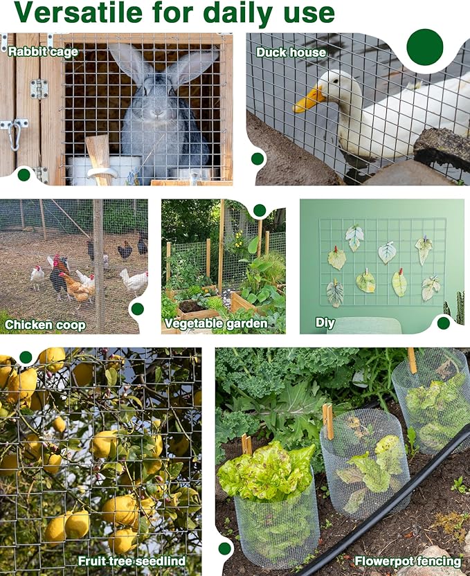 • Farm-Grade Animal Fencing: Ideal for farmers/ranchers, this chicken wire mesh secures chicken coops, duck runs, and rabbit hutches. Its reliable design keeps your poultry and small animals safely contained while blocking predators like weasels, snakes, and other unwanted intruders, protecting your livestock day and night