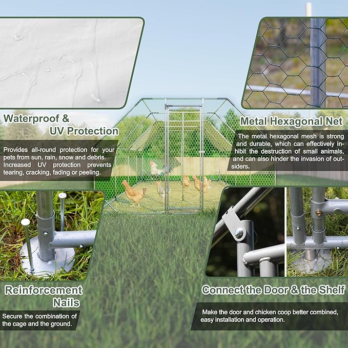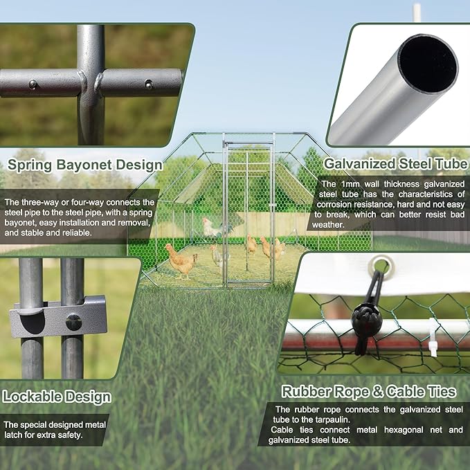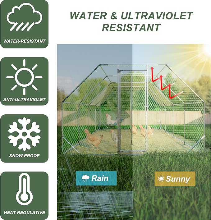 • 【Durable Steel Structure】The large metal chicken coop is made of high-quality galvanized steel, ensuring stability for long-term outside use, don't worry about rusting. The portable chicken pen has an upgrade reinforced design, which steel pipe diameter is thicker than most sold in the market, which is strong and stable enough in windy and heavy rain.