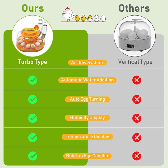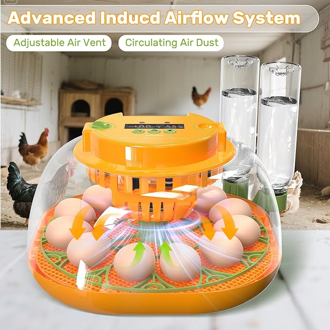 • Upgraded Smart Egg Incubator: Temperature and humidity display for precise monitoring. The 2-in-1 humidity control system and adjustable vent enable flexible humidity management. The built-in fan maintains stable airflow and temperature for optimal egg hatching, creating the best incubation environment.