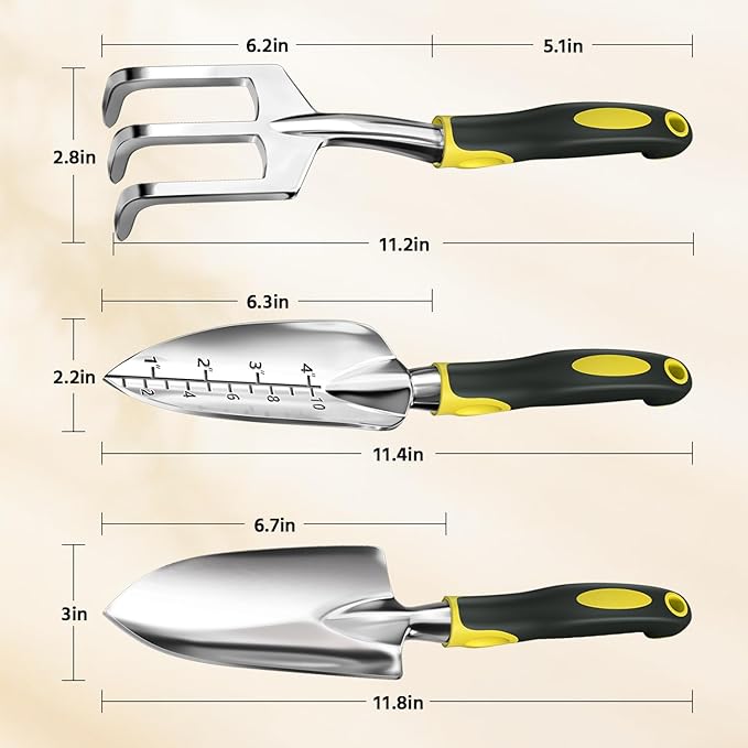 • 【All-in-One Gardening Kit】This 3-piece set includes a trowel, transplanter, and cultivator, providing all the tools you need for planting, digging, and soil cultivation. Enjoy exceptional value and versatility solution that makes your gardening more enjoyable, and more efficient.