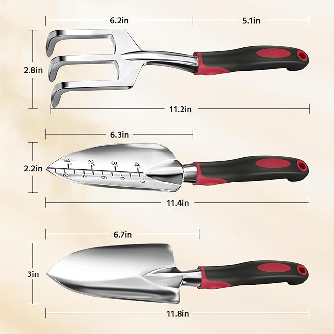• 【All-in-One Gardening Kit】This 3-piece set includes a trowel, transplanter, and cultivator, providing all the tools you need for planting, digging, and soil cultivation. Enjoy exceptional value and versatility solution that makes your gardening more enjoyable, and more efficient.
