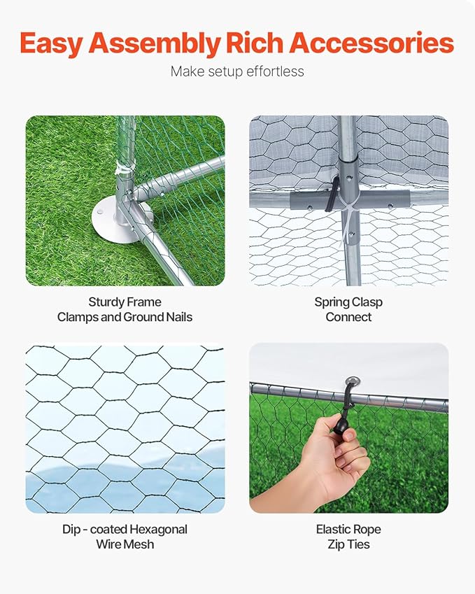 • Comfortable Experience: The large chicken run is equipped with a wide door for easy access without having to bend over. The safety lock design ensures that your poultry won't accidentally escape, significantly improving daily management convenience. Whether it's morning feeding or evening tidying up, you can carry out your tasks smoothly, saving you both time and effort.