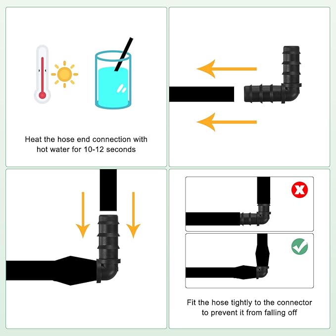 • [Installation] - It is easy to install, without glue or other tools. You can soften the pipe with hot water before use to better connect the irrigation connector. The connected irrigation pipe fits tightly and will not fall off