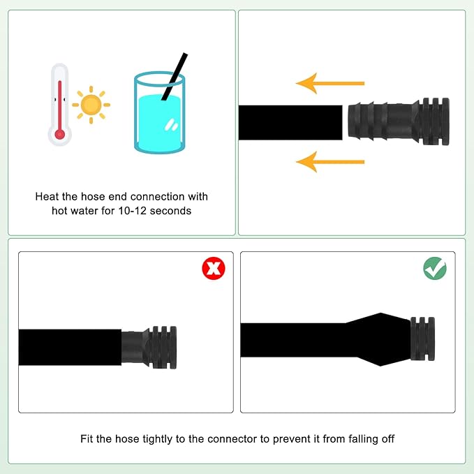 • [Installation] - It is easy to install, without glue or other tools. You can soften the pipe with hot water before use to better connect the irrigation connector. The connected irrigation pipe fits tightly and will not fall off