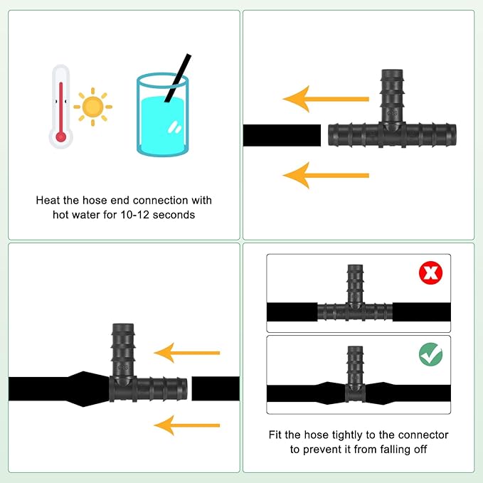• [Installation] - It is easy to install, without glue or other tools. You can soften the pipe with hot water before use to better connect the irrigation connector. The connected irrigation pipe fits tightly and will not fall off