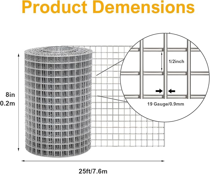 8in x 25ft Hardware Cloth - 1/2 inch Chicken Wire Fencing 19 Gauge Hot-dip Galvanized After Welding | Welded Wire Mesh Roll Garden Plant Chicken Coop Rabbit Poultry Netting Cage Screen