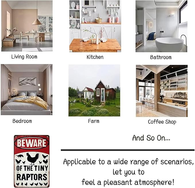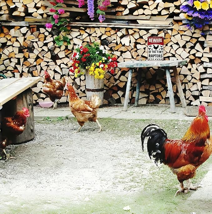 • Bold & Humorous Design: Features a striking red-and-white layout with bold text and a rooster + chicks silhouette. The playful warning ("Tiny Raptors") adds cheeky flair to coops, kitchens, or gardens.