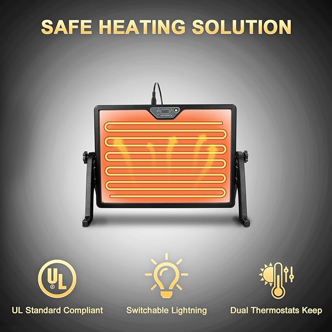 • SAFETY FEATURES: Made from flame-retardant ABS and aluminum composite, this heater is built to last. It includes a remote control and a 9.8-foot power cord for flexible placement. Using radiant heat, it provides warmth for chicks, puppies, kittens, and other small animals. Ideal for chicken coops, dog houses, barns, and cat houses, it helps maintain a comfortable environment, supporting better egg production during winter’s colder months
