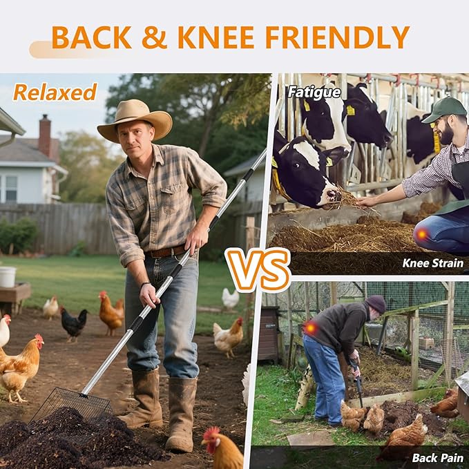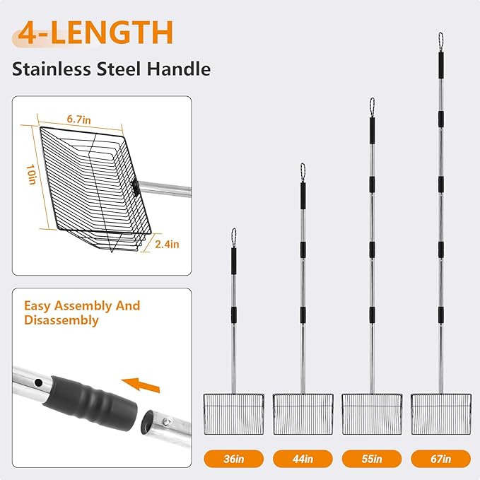 • 【Adjustable Handle Chicken Poop Rake (36", 44", 55", 67")】: Easily adapts to different heights and tasks (chicken coops, sandboxes, dog waste, horse stalls, etc.).The long handle (up to 68") minimizes bending, reducing back strain during cleaning.