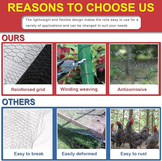 • 📏【Easy-Cut 36-Inch Chicken Wire Roll】Trim with scissors and bend to any shape! This 24-inch chicken wire roll fits irregular coops, gardens, or balconies. Lightweight yet durable, available in vinyl-coated (including black chicken wire) for weather resistance. No skills needed—perfect for DIYers.