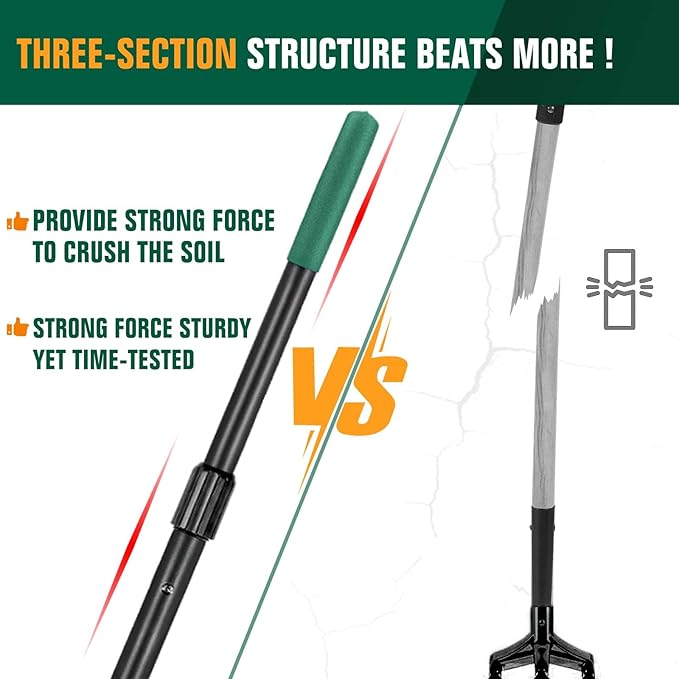 • REINFORCED&LONG-LASTING HANDLE BEATS MORE! ----- Built with solid steel and featured with reinforced 3-section designed, the handle of rotary cultivator tool ensure its sturdiness so it won’t bend after long-time use, the length are moderate, perfectly designed to fit your body, the extended handle of hand tiller cultivator won’t exhausted you after a long time working especially.
