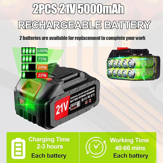 • 2025 UPGRADED ELECTRIC WEED WACKER: The cordless grass trimmer has been upgraded with smoother wheels, higher-strength blades and larger-capacity batteries.The multifunctional cordless electric weed wacker is versatile and can be used as grass trimmer, edger, lawn mower, easy for different cutting jobs, not limited by wires, you can mow anywhere. Weeding is as easy as walking and enjoy the fun of cutting.(fully charged before first use)