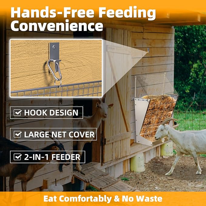 • 🌿TWO WAYS INSTALL - Goat hay feeder provides two installation options: use the adjustable hooks for tool-free mounting on tracks, chain-link, or hurricane fencing, or opt for wall mounting with the included screws and tools. It also includes a multi-functional carabiner clip for easy hay filling – just lock it onto the wall hook for a convenient feeding experience..