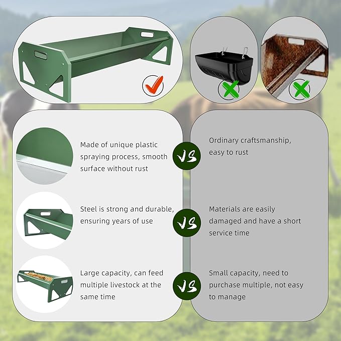 • Thickened and Upgraded: We have thickened and upgraded the goat feeder, it is more sturdy and stronger, it can withstand extreme weather conditions, the feed trough is made of stainless steel, rust and corrosion resistant, it can last for years to serve your livestock.