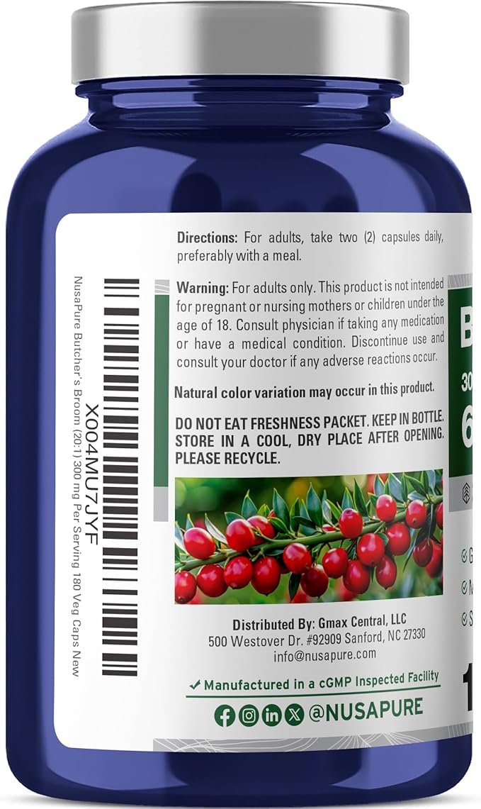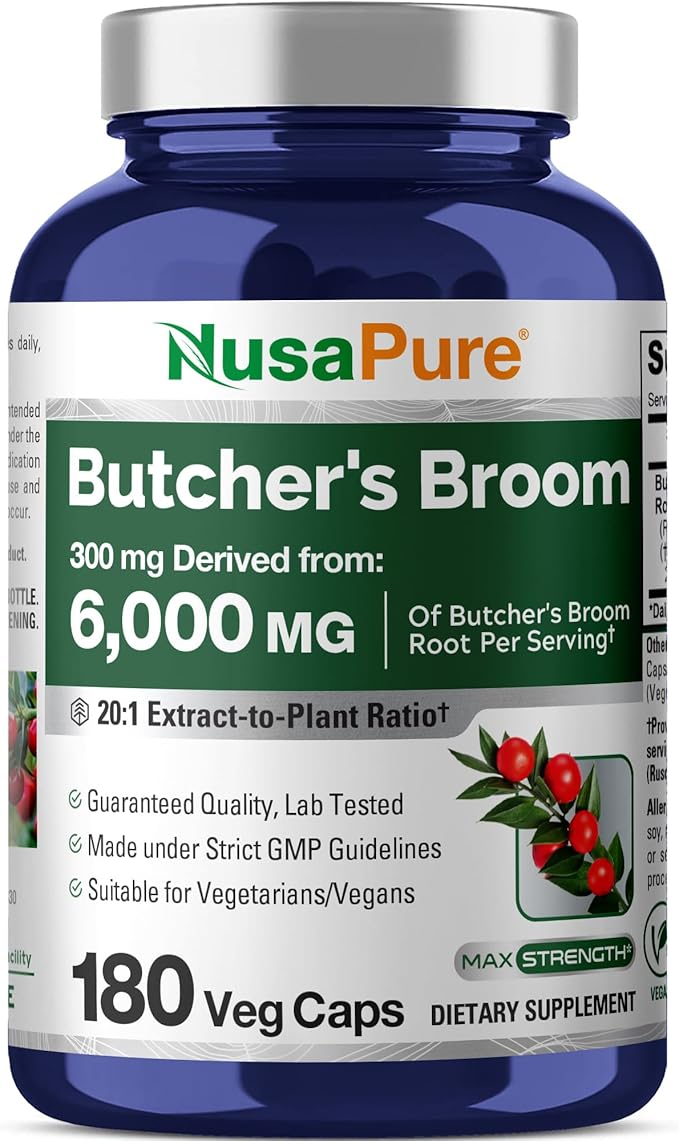 NusaPure Butcher's Broom Root 20:1 Extract, 300 mg Equivalent to 6,000 mg Veggie Caps 180 Count (Non-GMO, Vegan)