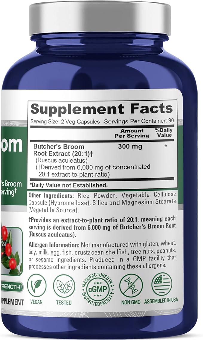 • Provides 300 mg of Butcher's Broom Root Extract per serving, derived from 6,000 mg of the plant using a 20:1 extract-to-plant ratio.