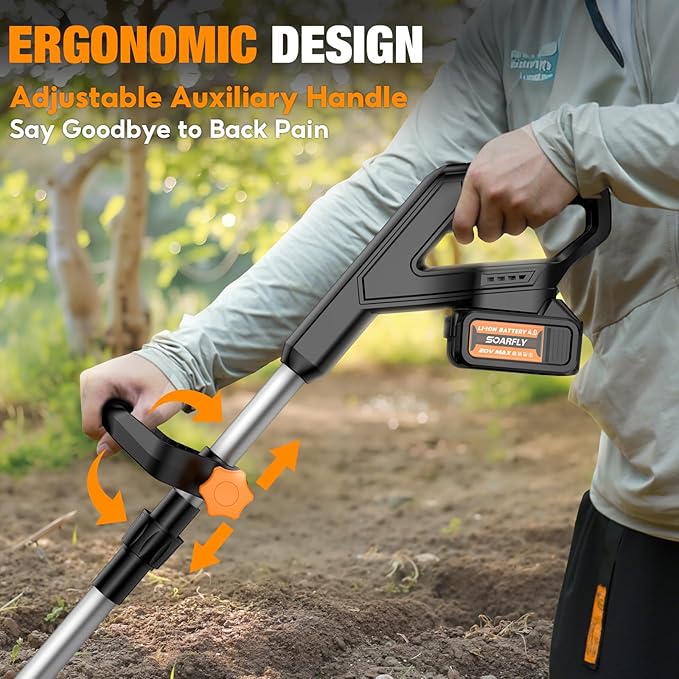 • ๐Ÿ’ช [UPGRADED ADJUSTABLE DESIGN FOR MAXIMUM COMFORT] - Designed with adjustable handle height and a customizable auxiliary handle, this battery tiller ensures comfortable use for all users. Whether youโ€™re tall or short, the adjustable height and handle reduce fatigue and make gardening a more enjoyable experience for everyone