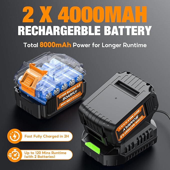 • ๐Ÿ”‹ [UPGRADED BATTERY LIFE FOR EXTENDED RUNTIME]- Comes with two 4.0Ah Li-ion batteries, offering up to 120 minutes of continuous operation. Swap batteries easily to finish your gardening tasks without interruption, ensuring long-lasting power and efficiency.