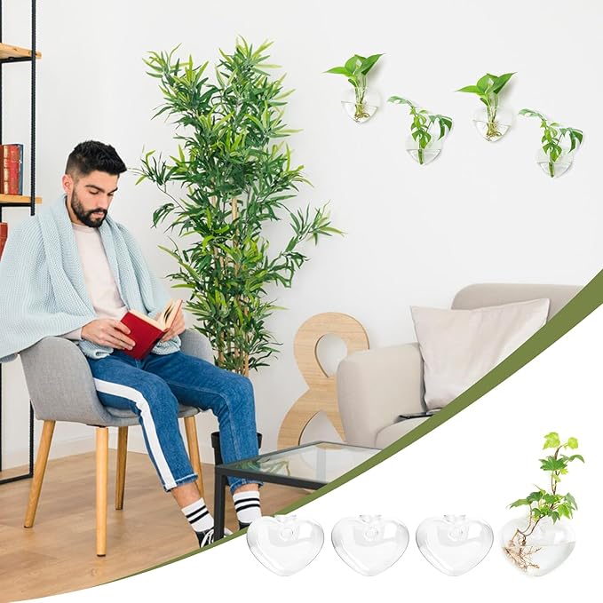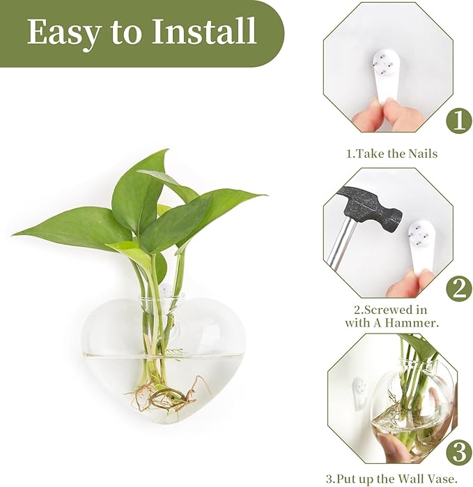 • 🌼Size and Accessories: Each propagation heart vase measures about 5.12 x 4.06 x 2.48 inches/ 13 x 10.3 x 6.3 cm.It's exquisite and small enough to decorate your space.Package included: 4 glass plant containers and 5 nail hooks. Note: Plants and decorations are NOT included!