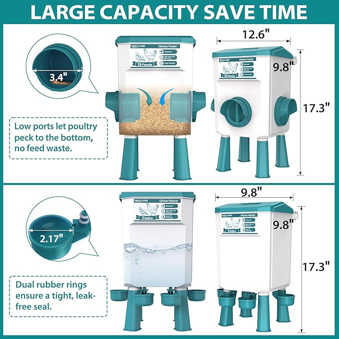 • EASY TO CLEAN & SAFE MATERIAL – The automatic chicken feeder and waterer are made from heat-resistant, eco-friendly BPA-free PP. The feeder ports feature smooth surfaces and wide openings—just rinse with water for easy cleaning. The water cups stay sanitary with minimal effort, keeping flock’s food and water fresh every day.