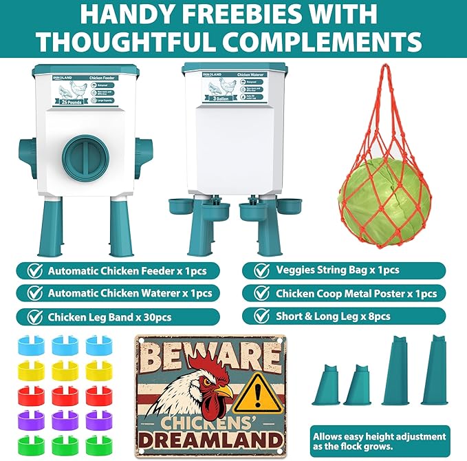 • ADJUSTABLE FOR ALL GROWTH STAGES – Comes with 4 bonus long legs, allowing easy height adjustment of the chick feeder and waterer as the flock grows. Perfect for chicks, layers, and chickens. The ergonomic design promotes natural feeding posture and healthy development. Perfect for both beginners and experienced poultry keepers, the set is a must-have!