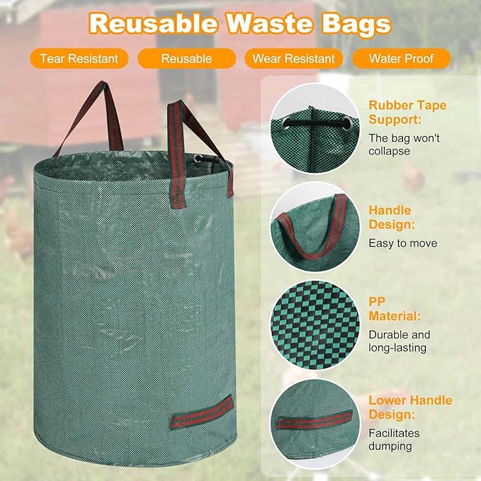 • 【Heavy Duty Waste Bags】: 26 Gallon Reusable Bags; Diameter 19", Height 25", Yard Waste Bags with Gloves. It's made from rugged rip-resistant polypropylene fabric; Well-made, Reusable, Standable waste bag. It's great for chicken coop, garden and farm