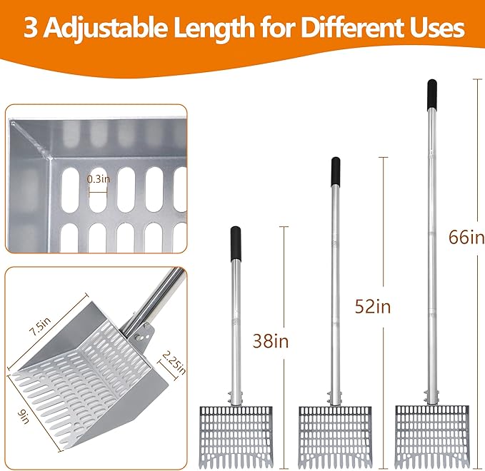• Reasonable Size: 0.3" holes are precise enough to sift out waste, thorough clean. 9" wide scoop is large enough for faster cleaning, yet nimble enough for corners. The adjustable handle extends to 38, 52, 66", minimize back strain