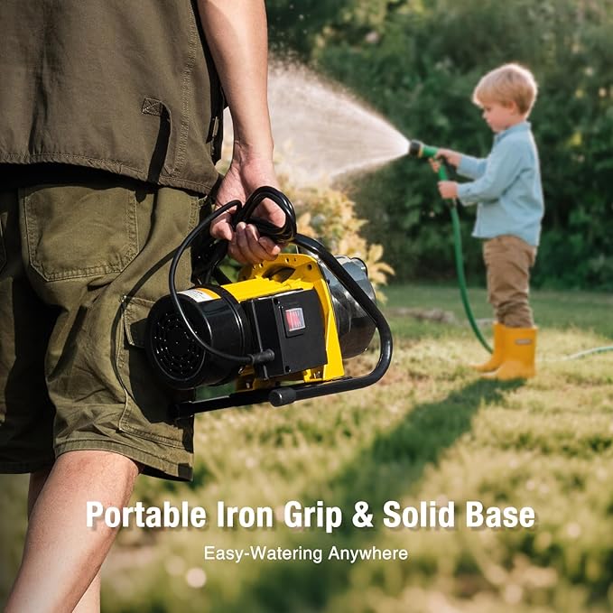 • Advanced Safety & User-Friendly Features: Operate with confidence thanks to built-in thermal overload protection that prevents motor burn-out. The IPX4 waterproof rating and safe switch ensure operation in damp conditions. Includes two adapters (1'' to 3/4'') for quick hose connections. The self-priming design and sturdy handle make setup and transport simple, saving you time and effort