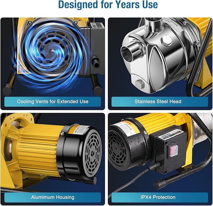 • Durable Construction for Long-Term Reliability: Built with a corrosion-resistant stainless steel pump head and heavy-duty aluminum housing, this pump resists rust and wear. The integrated iron stand provides stability on uneven ground. Unlike cheaper models that fail quickly, our pump is engineered for lasting performance, protecting your investment and eliminating frustrations from frequent replacements