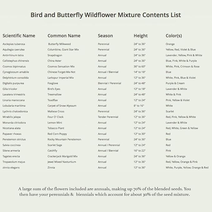 • Perennial Flower Seeds: Our Butterfly Mix contains a few perennial / tender perennial flower seeds, such as butterfly milkweed seeds, giant star columbine seeds, maltese cross seeds, scarlet salvia seeds & four o' clock seeds.