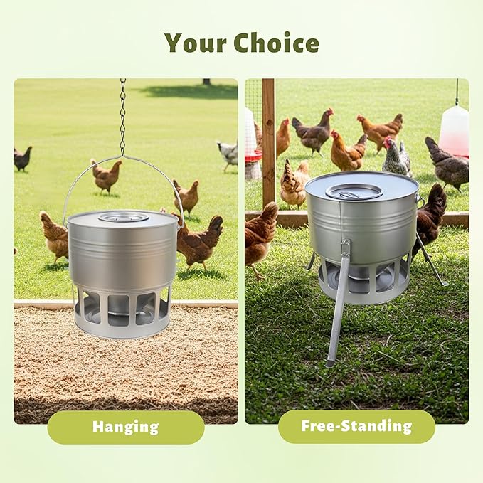 • Large Capacity & Durable Ground Design​: This 20lbs metal chicken feeder reduces frequent refilling and features a sturdy ground-mounted structure, perfect for flocks of all sizes. The powder coating ensures rust and corrosion resistance for long-lasting outdoor use.